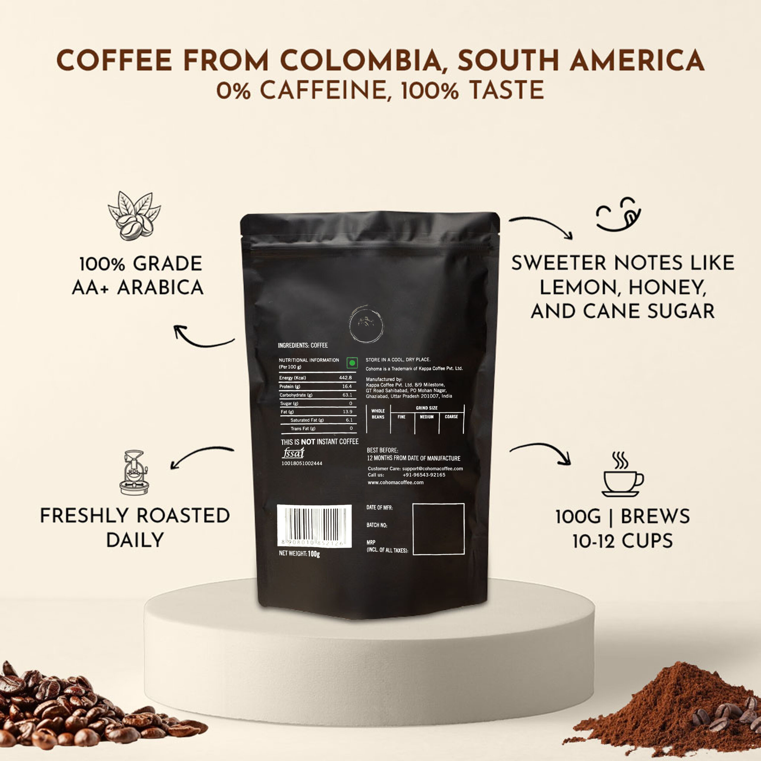 Our Grade A+ 100% Arabica decaf coffee from Colombia, South America tastes like real coffee, but has 0% caffeine. Medium body, balanced brightness and is fresh roasted in small batches.