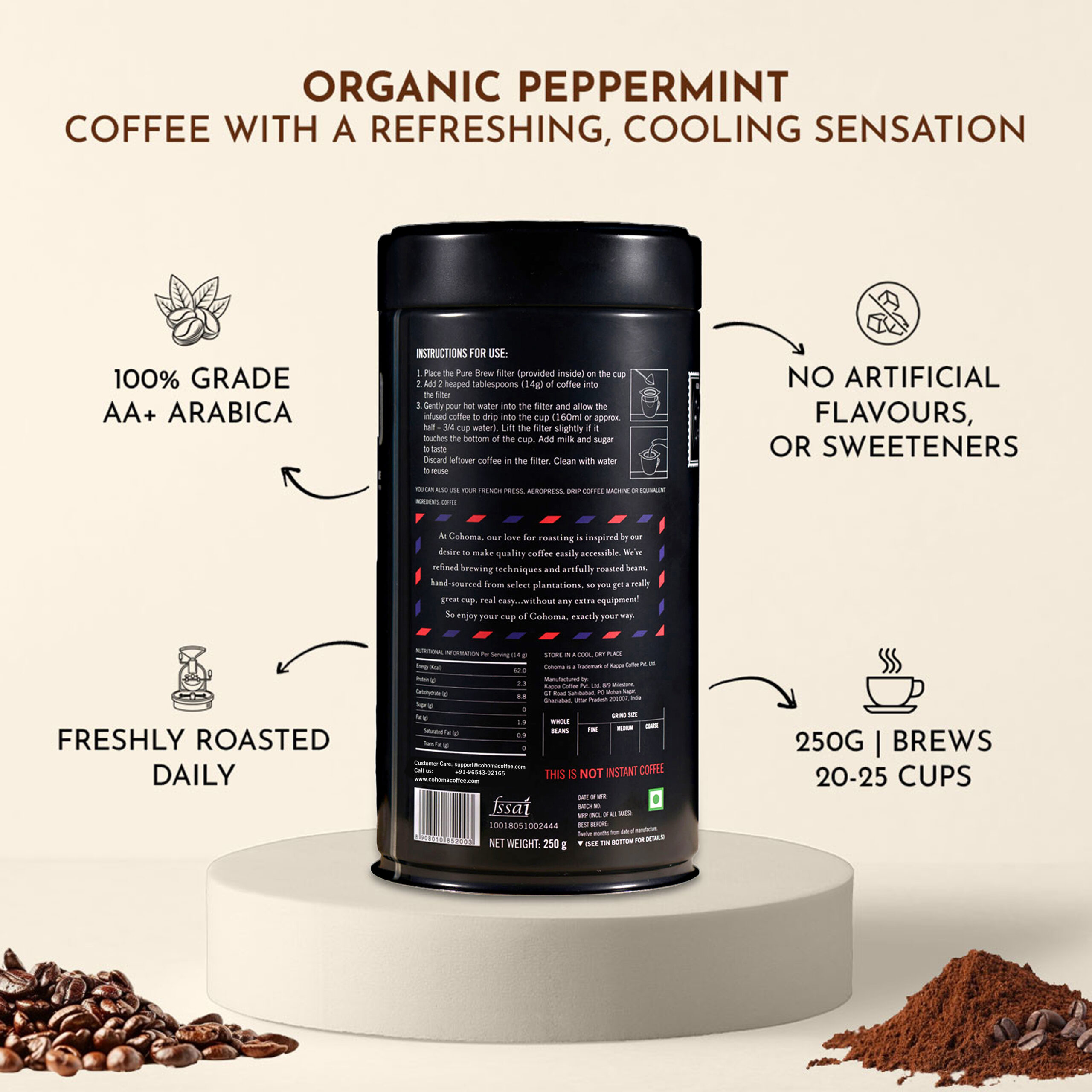 Our organic peppermint delivers a balanced, well rounded coffee taste with a cooling sensation. Natural flavour infused – no artificial flavors, or sweeteners!