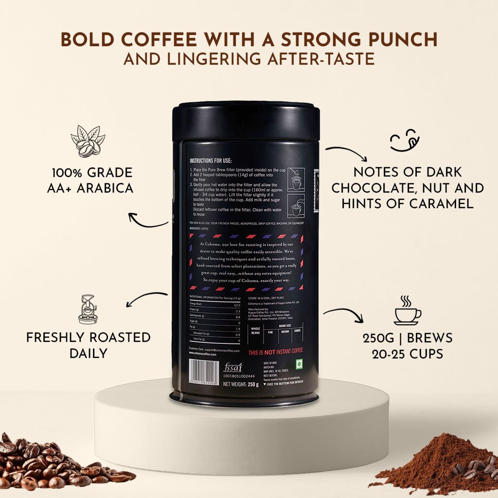 Signature roast that delivers a balanced cup with a bold, rich taste and a dark chocolate-biscuity finish.