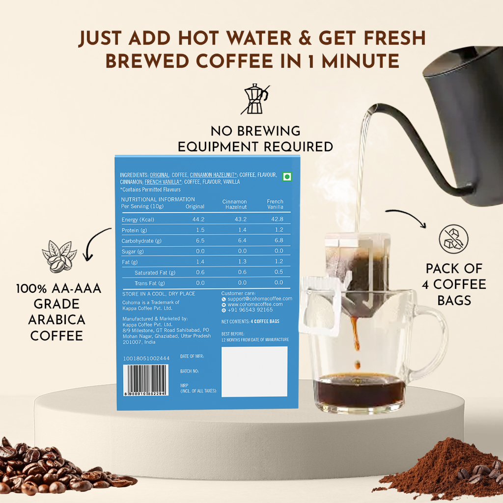 ✨ Enjoy a punch of strong cinnamon, well-rounded coffee taste, and a mild hazelnut finish in each sip. Just add hot water to our drip bags and get a fresh brewed cup in 1-2 minutes!