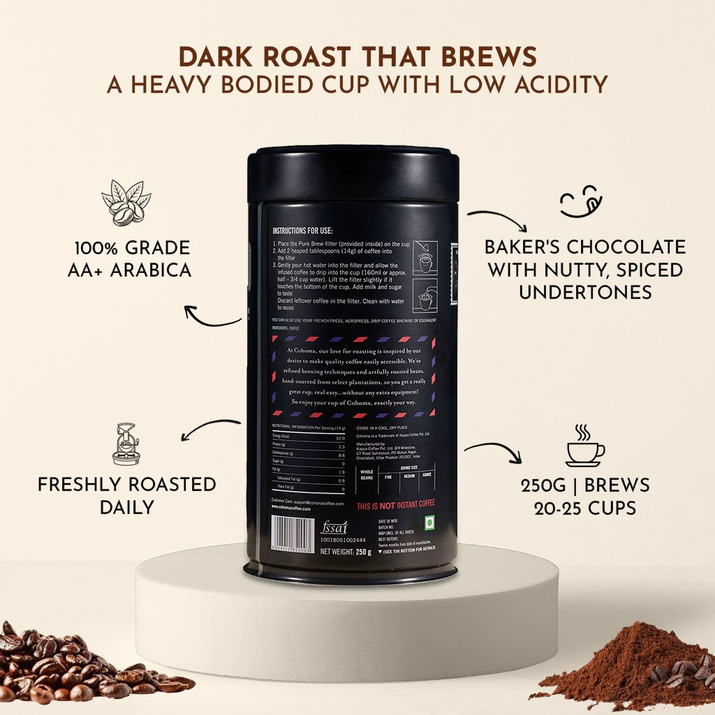 Signature roast that delivers a balanced cup with a bold, rich taste and a dark chocolate-biscuity finish.